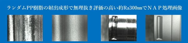 ランダムPP樹脂の射出成形金型のコアピンにアンダーカットによる勘合をNAP処理加工により離型改善した画像です。