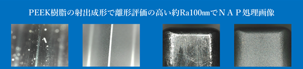 PEEK樹脂の射出成形金型の回転抜きコアピンと勘合穴コアピンをNAP処理加工により、離型改善効果により回転抜モーター負荷が下がり複数取が可能となりましたと、顧客様より情報がありました。