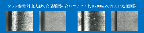 フッ素樹脂の射出成形金型のコアピンをNAP処理加工により、高温での離型でも変形が無く、サイクルアップが可能となりましたと、顧客様より情報がありました。