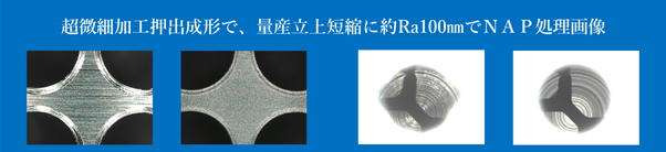 微細形押出成形金型をNAP処理加工により、切削跡、カエリ跡を除去する事で、長時間掛け研磨剤入り材料を流し金型をなじませる工程不要となり、即量産立上が可能となったと、顧客様より情報がありました。